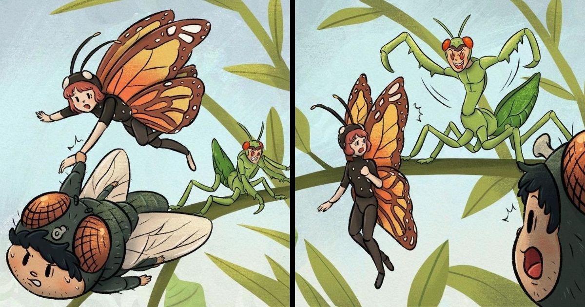 The story starts out with a beautiful friendship between a butterfly and a fly. The fly is passing by when he sees a beautiful butterfly waking up gracefully. They wave to greet each other, but suddenly a huge praying mantis tries to hurt this beautiful butterfly. The fly sees that and grabs the butterfly by her hand to save her. And that’s how their friendship is born. We think that after a few fun adventures together, this will end well, but that’s actually not the case.